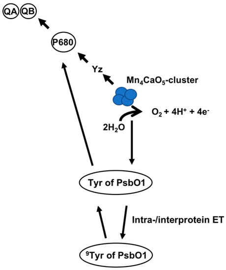 The 3D structure for plant PSII from pea [76] is the only currently available crystal structure of higher-plant PSII. Using this structure for plant PSII from pea [76] and a molecular graphics software (PyMOL Molecular Graphics System Software, ver. 2.0.7; Schrödinger, New York, NY, USA), 9Tyr of PsbO1 and the OEC were calculated to be 36.1Å apart. This is approximately five times greater than the distance between Yz and the OEC Mn4 cluster (Mn4Ca) (7.5–8.0 Å) [77,78], making it too large for direct interactions [77,79] between the 9Tyr of PsbO1 and OEC. However, electron transfer via peptide bonds as distant as more than 40 Å is reported [80]. Furthermore, a 134-Å electron transfer through the helical peptide was also reported [81]. In these cases, the amide groups reportedly act as quantum mechanical hopping sites for electron transfer. Long-range inter-protein electron transfer such as from cytochrome c to cytochrome c peroxidase has also been reported [82]. Moreover, electron transfer between the photosynthetic reaction center and cytochrome c across in Rhodobacter sphaeroides has been reported [83]. Taken together, inter-protein electron transfer plays a vital role in cellular metabolism including photosynthesis [82,83]. It is therefore postulated that long-range intra- and inter-protein electron transfer from PSII Mn cluster→9Tyr of PsbO1→P680+ (PSII primary electron donor) could support a hypothesis that 9Tyr of PsbO1 functions as an electronic element, like Yz, in PSII electron transport (Figure 8) [75].