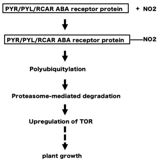 Plant growth requires the orchestration of a variety of cellular processes, which are controlled by regulatory proteins such as the serine/threonine protein kinase target of rapamycin (TOR), which forms complexes with regulatory proteins [82,85,86]. TOR plays a central role in auxin signal transduction in Arabidopsis [87]. TOR is downregulated by the plant hormone abscisic acid (ABA). ABA detection and signaling are mediated by the pyrabactin resistance1/PYR1-like/regulatory components of the ABA receptor (PYR/PYL/RCAR) family [83,88,89]. Tyrosine nitration of PYR/PYL/RCAR proteins reportedly results in polyubiquitylation and proteasome-mediated degradation [89]. Thus, the degradation of PYR/PYL/RCAR receptor proteins eventually results in upregulation of TOR and stimulation of plant growth [85]. Therefore, it is conceivable that NO2 may induce tyrosine nitration of PYR/PYL/RCAR proteins, to degrade these proteins and upregulate TOR regulatory complexes to stimulate plant growth (Figure 9).