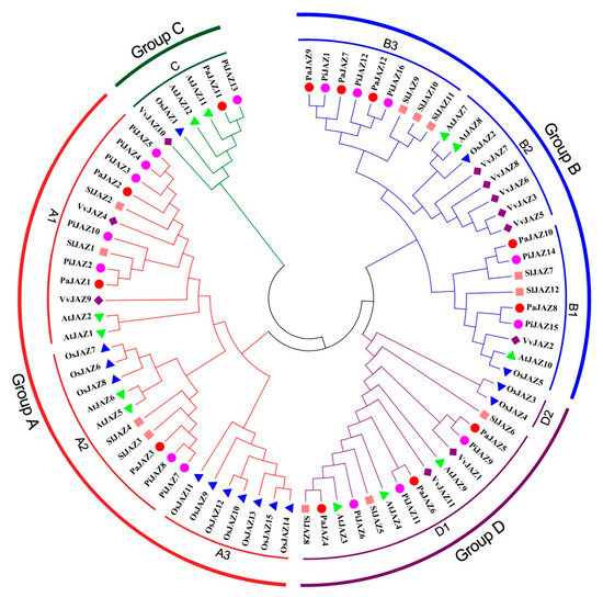 To discover the evolutionary relationships of JAZ family proteins between the two Petunia progenitors and A. thaliana, O. sativa, S. lycopersicum, and V. vinifera, a phylogenetic tree was generated by the NJ method based on multiple sequences alignment of 12 AtJAZ proteins, 15 OsJAZ proteins, 15 SlJAZ proteins, 11 VvJAZ proteins, 12 PaJAZ proteins, and 16 PiJAZ proteins. As shown in Figure 1, according to the phylogenetic grouping of JAZ proteins in Arabidopsis [27], all 78 JAZ protein members obtained from different plants could be divided into four groups (Groups A–D) and further classified into eight subgroups (A1–3, B1–3, C, and D1–2). All petunia JAZ proteins were distributed into six subgroups (A1, A2, B1, B3, C, and D1), while none were presented in the rest of subgroups. In general, the phylogenetic tree revealed that there was a closer relationship between petunia and tomato rather than Arabidopsis, grape, and rice in terms of the JAZ protein family, which tallied with the current established evolutionary relationships in plants [59].