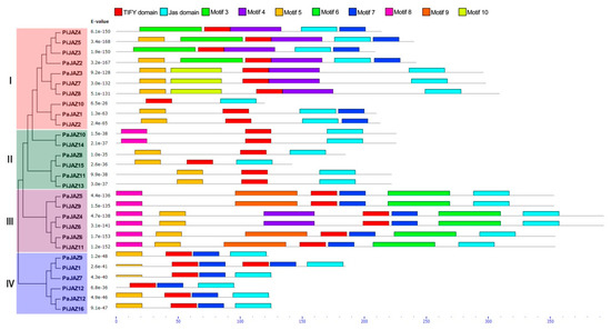 As shown in Figure 2, petunia JAZ proteins were classified into four distinct clusters (I, II, III, and IV) with a similar topology of the phylogenetic tree constructed above. MEME database search identified 10 conserved motifs (Figure S3); Motifs 1 and 2 were identified as the TIFY domain and the Jas domain, respectively, but the others had no functional annotations. Although the lengths of petunia JAZ protein sequences were discrepant, members that clustered together tended to possess a significantly similar number and composition of conserved motifs. On the other hand, each cluster shared similar motif features, which could further support the phylogenetic grouping of the JAZ family.