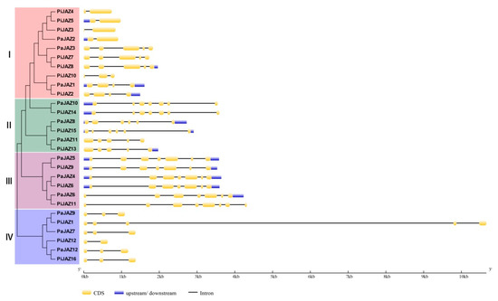 The divergence in the gene structure could promote the evolution of gene families to support the phylogenetic classification [60]. Among the petunia JAZ family genes, the number of introns ranged from one to seven, and exons ranged from one to eight. The results implied that a strong correlation existed between gene structure and phylogenesis (Figure 3). Petunia JAZ genes that clustered at the branch tips of the phylogenetic tree usually possessed a similar gene structure—that is, members in one cluster generally showed similar exon/intron numbers and distribution patterns. For instance, the orthologous pairs PaJAZ10/PiJAZ14, PaJAZ5/PiJAZ9, or PaJAZ4/PiJAZ6 had almost the same gene structures, and they displayed a closer evolutionary relationship. Moreover, we also noted that all JAZ genes in cluster IV had no upstream/downstream regions.