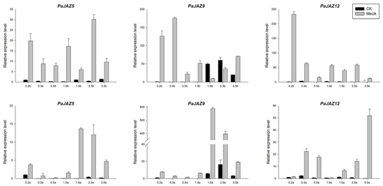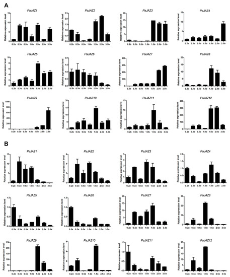 To reveal the expression patterns under MeJA treatment, PaJAZ5, PaJAZ9, and PaJAZ12 genes were selected to conduct qRT-PCR analyses. As shown in Figure 6, except PaJAZ9 at 1.5b and 2.5b stages, the expression levels of these three genes were generally up-regulated during the development of flower buds and anthers after MeJA treatment, and the changes were extremely significant at some stages. Furthermore, the expression patterns of these three genes after the treatment were fluctuating in flower buds, but it showed relatively high expression levels at the later developmental stages in anthers.