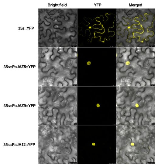 Due to their differential expression patterns, PaJAZ5, PaJAZ9, and PaJAZ12 were selected to construct the 35s::PaJAZs::YFP fusion vectors and then transiently expressed in leaves of tobacco to investigate the subcellular localization. A Leica confocal laser scanning microscopy was adopted to observe the fluorescence in leaf epidermal cells. As shown in Figure 7, YFP fluorescence of the 35s::YFP could be detected in the whole leaf cells, and the fluorescence of three fusion proteins was mainly accumulated in cell nuclei, indicating that PaJAZ5, PaJAZ9, and PaJAZ12 proteins localized in the cell nucleus. The results were consistent with the predication of subcellular localization using Plant-mPLoc.