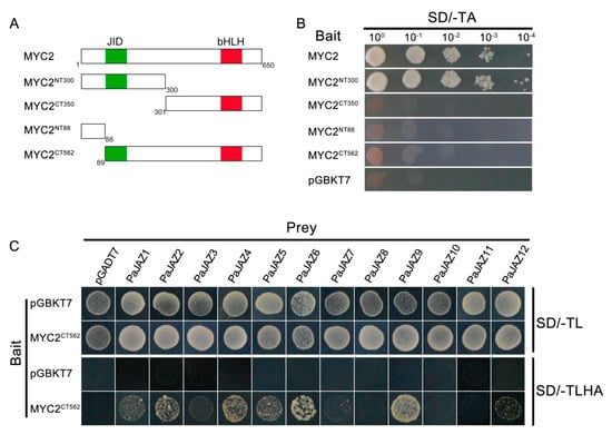 As a first step for any Y2H assays, it is essential to verity that the bait will not automatically activate reporter genes without a prey protein. At this point, full-length MYC2 or several MYC2 truncated derivatives were fused to pGBKT7 vectors to construct bait vectors and then transformed into yeast competent cells AH109 to test the autoactivation. As shown in Figure 8A,B, the cells transformed the bait vectors fused full-length MYC2 or derivative MYC2NT300 exhibited autoactivation of growing on the SD/-TA medium. However, derivatives MYC2CT350, MYC2NT88, and MYC2CT562 did not exhibit autoactivation.