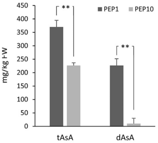 The concentration of total ascorbic acid (tAsA) and reduced AsA (dAsA) in leaves of the two cultivars differed significantly. Specifically, the variety PEP1 had a significantly higher content of tAsA and dAsA compared to PEP10 (Figure 1). Moreover, differences were also evident in the percentage of reduced ascorbate relative tAsA, which was 61% for PEP1 and 4% for PEP10.