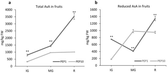 While at the different stages under investigation (i.e., immature green, IG, mature green, MG, and mature, fully red, R) PEP1 always accumulated more tASA than PEP10, the difference in total ascorbic acid between the two varieties increased during fruit development. PEP11 accumulated more tAsA following MG, where fruits reached their final size, while it did not significantly increase in PEP 10. In this variety, a similar trend was also present for the dAsA, whose concentration did not significantly change at end of fruit cycle. While the accumulation of tASA and dAsA during maturation followed the same trend in PEP10, in PEP1 the increase of tAsA was accompanied by a decrease in dAsA and vice versa.