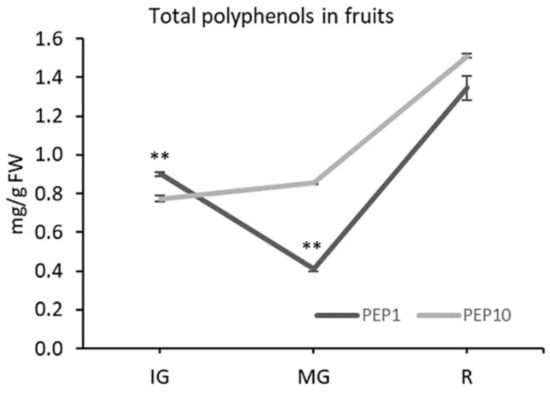 Total polyphenol concentration (mg/g FW) during fruit development. Data are mean ± s.d. of three biological replicates. IG: immature green; MG: mature green; R: red. At each stage, asterisks indicate a statistically significant difference between varieties (** p < 0.01; t-test).