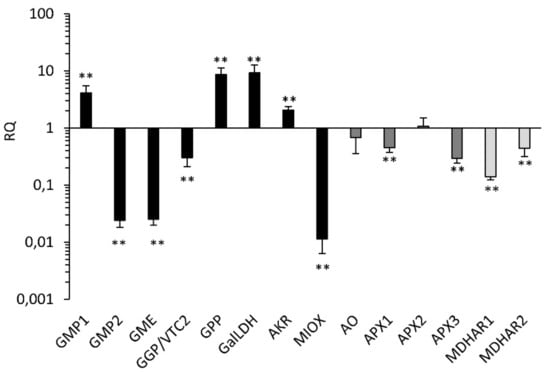 Relative gene expression by real-time PCR of genes involved in AsA accumulation in leaves of the two pepper varieties (black bars designate genes involved in AsA biosynthesis, dark grey bars those involved in AsA oxidation, and light grey bars those involved in recycling, according to Alos et al. 2013). Quantities (RQ) are relative to the calibrator genotype (PEP10) and are graphed on a logarithmic scale. For each gene, asterisks indicate that the 2−ΔCt values were significantly different between the test and calibrator genotype (** p < 0.01; t-test).