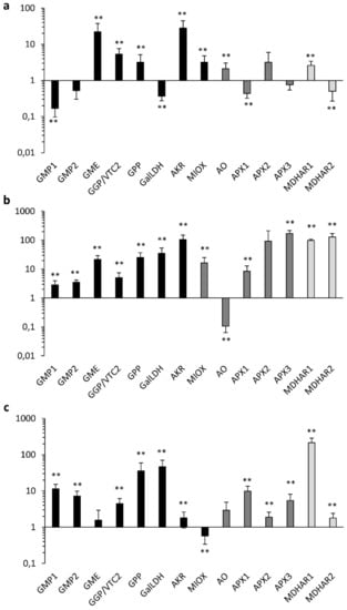 Relative gene expression by real-time PCR of genes involved in AsA accumulation in fruits of the two pepper varieties (black bars designate genes involved in AsA biosynthesis, dark grey bars those involved in AsA oxidation, and light grey bars those involved in recycling, according to Alos et al. 2013). Quantities (RQ) are relative to the calibrator genotype (PEP10) and are graphed on a logarithmic scale. (a): immature green (IG); (b): mature green (MG); (c): red (R). For each gene, asterisks indicate that the 2−ΔCt values were significantly different between the test and calibrator genotype (** p < 0.01; t-test).