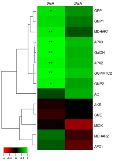 Heatmap of the correlations between gene expression states and tAsA or dAsA in pepper fruits. Gradation from red to green represents negative from positive correlations according to the color scale at the bottom. Asterisks indicate a statistical significant correlation (*: p < 0.05; **: p < 0.01).