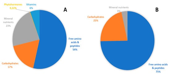 Main components (as percentage of the total) of tropical plant extract enriched with micronutrients (A) and vegetal-derived protein hydrolysate (B) tested in the present trial.