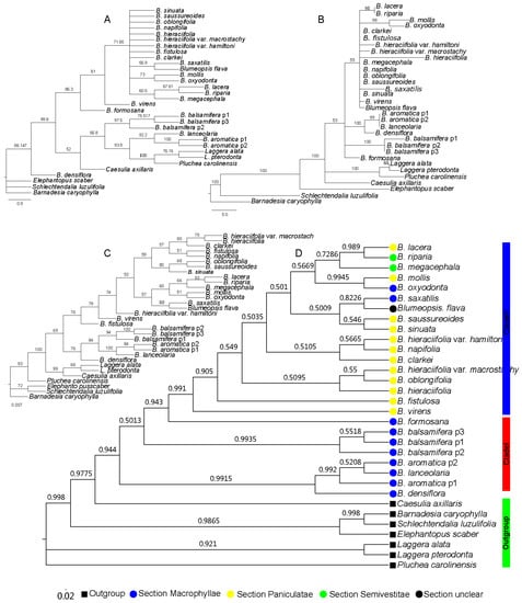 Based on the sequence of nrDNA ITS, with four different phylogenetic analysis methods—Neighbor-joining (NJ), Maximum Parsimony (MP), Maximum Likelihood (ML), and Bayesian inference (BI)—the results of all indicated that the Blumea genus was monophyletic, but the topology of the four methods was different. For example, the topology of the NJ method (Figure 1A) indicated that Blumea could be divided into two clades. The phylogenetic relationship of the B. aromatica clade may be clear, but the phylogenetic relationships of the others were disordered, also with very low posterior probabilities. The results from the MP method (Figure 1B) seem to mostly conform to the traditional classification relationship of Blumea; the genus could be divided into three clades: clade B. balsamifera was the basal clade, the B. aromatica clade may be the transitional clade, and others may be the higher group with more extensive environmental adaptability, such as with one-year lifetime, diverse habitats, and morphological characteristics. The results of the BI method (Figure 1C) seem to be the same as those of the NJ method; also, with high posterior probabilities, but Caesulia axillaris Roxb is placed in the B. aromatica clade. The topology with different methods was compared with TreePuzzle 5.3.rc16 [18] and CONSEL [19], and the results indicated that the ML method was the most suitable tree-reconstruction method for ITS sequences and with first rank (Table 2). The genus of Blumea could be divided into two major clades based on the phylogenetic tree with ITS sequence and the MP method (Figure 1D). Clade I consisted of three species of Macrophyllae (including B. aromatica, B. densiflora, and B. balsamifera) and one species of section Paniculatae (B. lanceolaria (Roxb.) Druce.), but with a very low bootstrap. Clade II, with a perfect bootstrap, consisted of three subclades and two single species, B. virens DC. and B. fistulosa. Subclade I consisted of three species of section Paniculatae (including B. saussureoides Chang & Tseng, B. sinuata (Lour.) Merr., B. oblongifolia Kitam, and B. lacera (Burm. f.) DC.), with an ideal bootstrap value. Subclade II consisted of three species (B. oxyodonta DC., B. mollis (Burm. f.) DC., and B. hieraciifolia (D. Don) DC.) and two variants of B. hieraciifolia (B. hieraciifolia var. hamiltoni and B. hieraciifolia var. macrostachy). Subclade III consisted of seven species, but with diverse inscape, which include two species belong to Semivestitae section (B. megacephala and B. riparia), two species belong to Macrophyllae section (B. formosana and B. saxatilis Zoll. & Mor.), two species belong to Paniculatae section (B. napifolia DC. and B. clarkei Hook. f.), and Blumeopsis flava Gagnep.