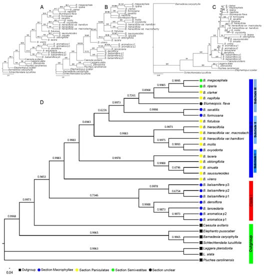 To reconstruct a more accurate phylogeny of Blumea, first, a single sequence or combined sequence was used for constructing a phylogeny tree while using four phylogenetic tree construction methods: neighbor-joining (NJ) method, the maximum parsimony (MP) method, the maximum likelihood (ML) method, and the Bayesian inference (BI) method in PAUP 4.0a164 [15], IQ-TREE [49,50], and MrBayes 3.2.6 [51]. Afterwards, the topology of the phylogenetic tree was evaluated with different methods in TreePuzzle 5.3.rc16 [18] and CONSEL software [19]. The phylogenetic trees with the best topology were edited with FigTree 1.4.2 (http://tree.bio.ed.ac.uk/software/figtree/) and Inkscape 0.9.2 (https://inkscape.org/).