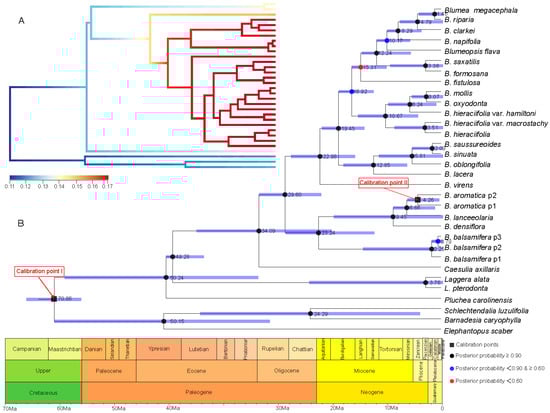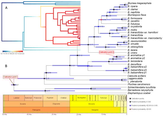 Divergence time estimation and speciation–extinction rate analysis based on the root age of Asteraceae as 49–42 Ma [20,21,22] and combined sequence. (A) The speciation–extinction rates analysis performed by BAMM [23] and BAMMtools [24]. (B) The divergence time estimation performed by BEAST 1.10.4 [25], and geological time scale visualized with the strap package [26]. The values beside nodes indicate the estimated median time of differentiation, and error bars indicate 95% highest posterior density (HPD) of differentiation. The black squares on nodes indicate calibration time. The circles with black, blue and red respectively indicate posterior probability more than 0.90, 0.60–0.90, and less than 0.60.