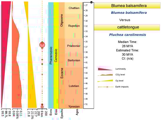 Two series of divergence time were estimated with two different root ages of Asteraceae (76–66 Ma [27] and 49–42 Ma [20,21,22]) (Figure 4 and Figure 5). A third web tool, TimeTree (http://www.timetree.org/) [28], was used for further divergence time estimation and for making the final decision. The results indicated that the median divergence time of B. balsamifera and Plumea carolinensis (Jacq.) G. Don. may have been in the early Miocene, around 26 Ma ago (Figure 6). Combining the results of TimeTree with the two calibration points for the root age of Asteraceae, we think that the root age of Asteraceae of 76–66 Ma [27] may be relatively accurate divergence time estimation for Blumea. First, based on the paleogeography and paleoclimate of the Oligocene (Figure 6), the Oligocene interrupted the temperature decline in the Paleogene (~33.5 Ma ago), and a stepwise climate increase began at 32.5 Ma and lasted until 25.5 Ma ago [29,30], also accompanied with a reduction of the CO2/O2 rate. This same time was the most important period for grassland and forest expansion, and the sunflower family also underwent an explosive expansion during this time [27]. The early Miocene (~20 Ma ago) is the time of formation and differentiation of Malaysian flora [31]. The old Chinese mainland, because of the relatively warm climate, was the most fertile area on Earth, had become one diversity center of earth. The genus of Blumea, which mostly originated from palaeotropical region, had moved to south China, also accompanied with an explosive expansion for more herbal members, such as B. saussureoides, B. sinuata, B. oblongifolia, B. lacera, and others that are more suitable for the low CO2/O2 rate.
