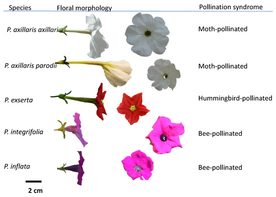 - Dell’olivo, A.; Hoballah, M.E.; Gübitz, T.; Kuhlemeier, C. Isolation barriers between Petunia axillaris and Petunia integrifolia (Solanaceae). Evolution 2011, 65, 1979–1991. [Google Scholar] [CrossRef] [PubMed]