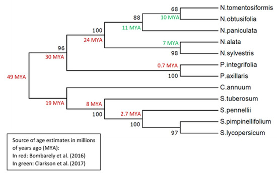 - Clarkson, J.J.; Dodsworth, S.; Chase, M.W. Time-calibrated phylogenetic trees establish a lag between polyploidisation and diversification in Nicotiana (Solanaceae). Plant Syst. Evol. 2017, 303, 1001–1012. [Google Scholar] [CrossRef]