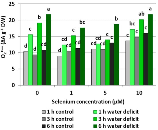 An appropriate concentration of Se may affect the level of ROS, including O2•−, which takes place through three processes: The spontaneous O2•− dismutation to H2O2 (in a non-catalysed by an SOD reaction), the direct removal of O2•− and H2O2 by Se compounds, and the regulation of antioxidant enzyme activity [,]. It is worth noting that ROS generation under stress conditions can exert an effect that is not only damaging, because both H2O2 and O2•− assign a signalling role in the induction of defence and acclimatization processes to stress factors and unfavourable environmental conditions [].