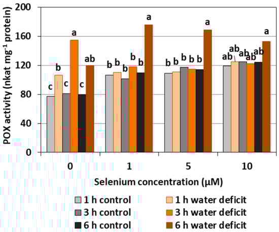 The peroxidase (POX) activity in the roots of cucumber seedlings pre-treated with Se and subjected to a WD. Bars marked with the same letters do not differ significantly at p < 0.05.