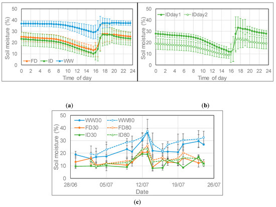 Average (± SD) daily profile of soil moisture content at low ozone (O3) (a) at three irrigation regimes (n = 27 (days)), (b) at ID irrigation on day 1 (full watering; n = 13 (days)) and day 2 (very limited watering; n = 14 (days)) and (c) average (± SD; n = 4) soil moisture content at low and high O3 between 14:30 and 15:00 at three watering regimes for the period 26 June–23 July 2018, with high O3 exposure starting on 28 June. Wheat plants were watered between 15:30 and 17:30; WW = well-watered; FD = frequent deficit irrigation; ID = infrequent deficit irrigation; 30 = peak O3 concentration of 30 ppb; 80 = peak O3 concentration of 80 ppb.