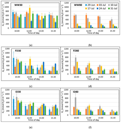 Stomatal conductance (gs) of the flag leaf wheat at low (a,c,e) and high (b,d,f) O3 concentrations and three irrigation regimes between 29 June (only measured at low O3) and 31 July at four different times of the day. The treatments were applied for the period 26 June–23 July 2018, with high O3 exposure starting on 28 June. Data for 29 June were not included in the statistical analysis as they were only obtained for low O3. WW = well-watered (a,b); FD = frequent deficit irrigation (c,d); ID = infrequent deficit irrigation (e,f), with low volume applied on the day before 29 June, 3 July, and 24 July; 30 = peak O3 concentration of 30 ppb; 80 = peak O3 concentration of 80 ppb. Values are averages (± SE; n = 4).