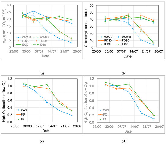 Light-saturated rate of photosynthesis (a,c) and chlorophyll content index (b,d) of the flag leaf of wheat at low and high O3 concentrations and three irrigation regimes between 28 June and 25 July. The bottom graphs (c—Asat, d—CCI) show the fraction of the values for both parameters at high compared to low O3. The treatments were applied for the period 26 June–23 July 2018, with high O3 exposure starting on 28 June. WW = well-watered; FD = frequent deficit irrigation; ID = infrequent deficit irrigation (with low volume applied on the day before 11 and 18 July); 30 = peak O3 concentration of 30 ppb; 80 = peak O3 concentration of 80 ppb. Values are averages (± SE; n = 4).