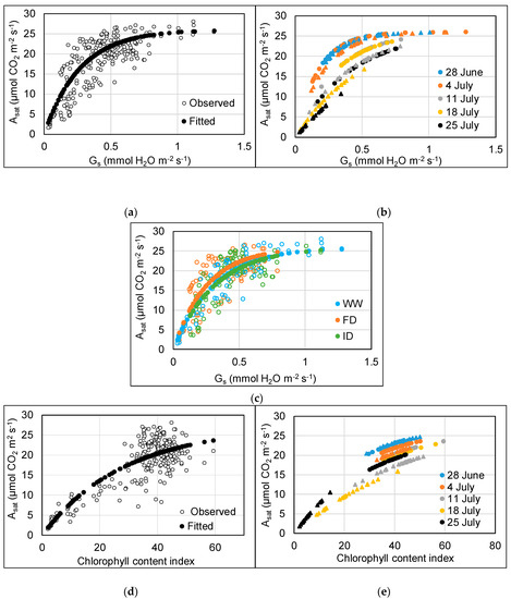 The Asat vs. gs rate constant was greater for the FD than the WW (p = 0.02) and ID treatment (p < 0.01) (Figure 4c). There was no effect of water treatment on the relationship between Asat and CCI (p = 0.30). The sometimes relatively high CCI compared to Asat at a CCI above 26 (Figure 4d) reflects the earlier decline in Asat compared to CCI in the WW treatments at 80 ppb O3. At low O3, there were no CCI values below 30.