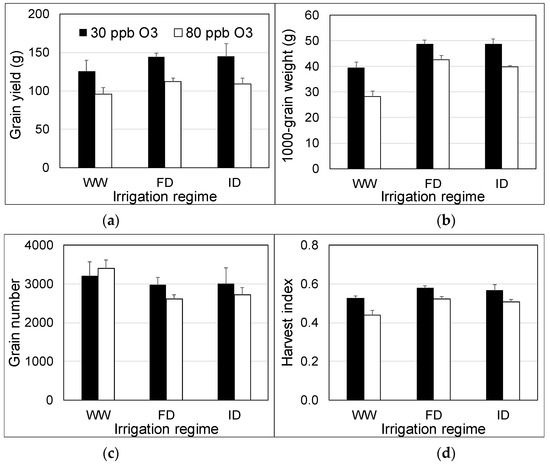Yield ((a) grain yield, (b) 1000-grain weight, (c) grain number), and harvest index (d) of wheat at 30 and 80 ppb peak O3 concentrations and three irrigation regimes applied between 26 June and 23 July 2018. WW = well-watered; FD = frequent deficit irrigation; ID = infrequent deficit irrigation. Values are averages (±SE; n = 4).