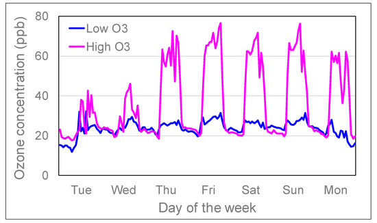Average hourly O3 concentrations in ‘low’ and ‘high’ solardomes at Abergwyngregyn, near Bangor, North Wales, between 26 June and 23 July in 2018.