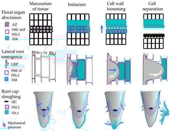 - Kumpf, R.P.; Shi, C.L.; Larrieu, A.; Sto, I.M.; Butenko, M.A.; Peret, B.; Riiser, E.S.; Bennett, M.J.; Aalen, R.B. Floral organ abscission peptide IDA and its HAE/HSL2 receptors control cell separation during lateral root emergence. Proc. Natl. Acad. Sci. USA 2013, 110. [Google Scholar] [CrossRef] [PubMed]