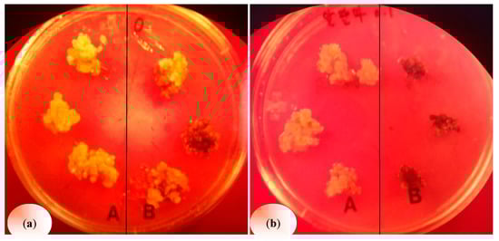 (A) Callus growth in the absence of alfalfa leaf extract. (a) Callus of C. album; (b) callus of P. oleracea. (B) Callus growth in the MS medium supplemented with 0.1% alfalfa leaf extract. (a) Callus of C. album; (b) callus of P. oleracea.