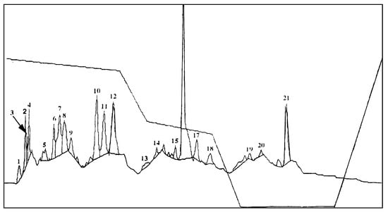 Chromatogram of alfalfa root parts–derived saponins. Peak 10: 3-Glc, 28 AraRhaXyl medicagenic acid (MA); peak 12: 3-Glc, 28-Glc MA; peak 16: 3-GlcA, 28 AraRhaXyl MA; peak 18: soyasaponin I; and peak 21: 3Glc MA.