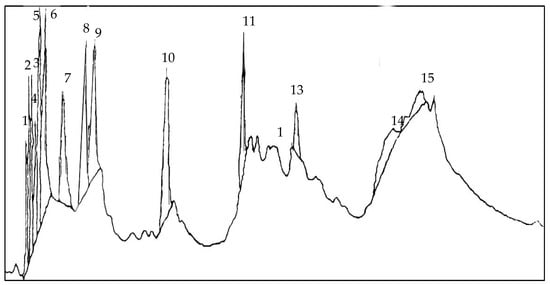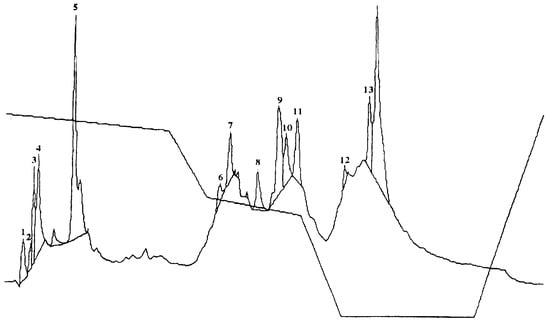 Chromatogram of prosaponin from alkaline hydrolysis of zanhic acid tridesmoside. Peak 11: zanhic acid.