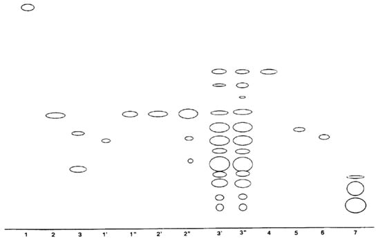 Thin-layer chromatography of crude extracts from alfalfa leaves, stems, and roots under UV light. 1: Medicagenic acid; 2: Soyasaponin 1; 3: 3-Glc-Glc, 28 AraRhaXyl medicagenic acid; 1′ and 1”: Stem samples; 2′ and 2”: Leaf samples; 3′ and 3”: Root samples; 4: 3-Glc, 28-Glc medicagenic acid; 5: 3-Glc, 28 AraRhaXyl medicagenic acid; 6: 3-GlcA, 28 AraRha medicagenic acid; and 7: Zanhic acid tridesmoside.