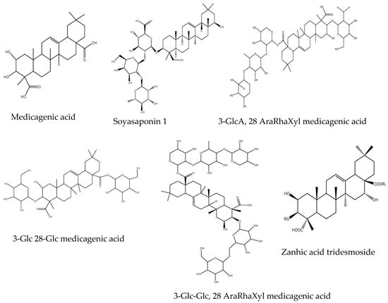 - Tava, A.; Avato, P. Chemical and biological activity of triterpene saponins from Medicago species. Nat. Prod. Commun. 2006, 1, 1159–1180. [Google Scholar] [CrossRef]
