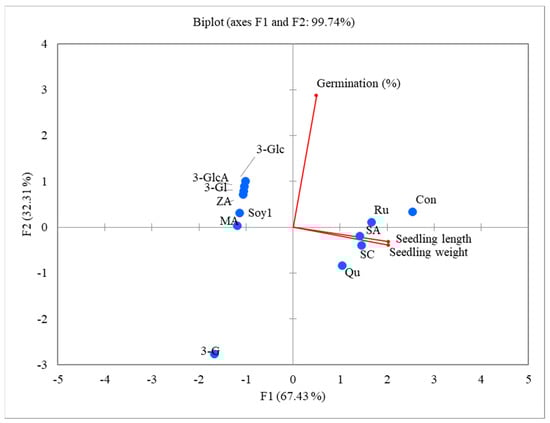 Principal composition analysis (PCA) biplot constructed by plotting the PC1 (vertical axis) scores against the PC2 (horizontal axis) scores obtained from phenolic compounds and saponins. MA: Medicagenic acid; Soy1: Soyasaponin I; 3G: 3-Glc-Glc, 28 AraRhaXyl medicagenic acid; 3-Gl: 3-Glc, 28-Glc medicagenic acid; 3-Glc: 3-Glc, 28 AraRhaXyl medicagenic acid; 3-GlcA: 3-GlcA, 28 AraRha medicagenic acid; ZA: Zanhic acid tridesmoside; Ru: Rutin; SA: Salicylic acid; SC: Scopoletin; Qu: Quercetin; and Con: Control.