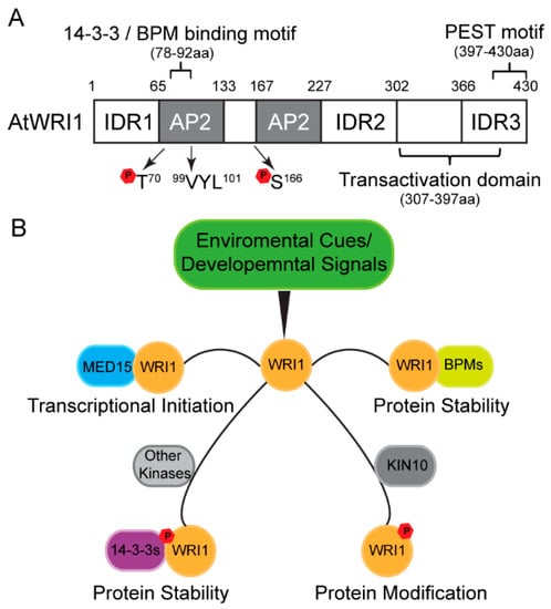 Many proteins do not have a rigid three-dimensional structure, and intrinsic disordered regions (IDRs) have been broadly identified in eukaryotic proteins [,,]. Recent work showed that AtWRI1 possesses three IDRs, as predicted by in silico analysis []. Functional characterization led to the identification of a PEST motif (a peptide signal for proteolysis), located in IDR3 of AtWRI1, and a transactivation domain (TAD) []. Both the IDR3-PEST motif and TAD are located at the C-terminus without overlapping (Figure 1A). Engineered AtWRI1s with either deletion of IDR3-PEST or mutations in possible phosphorylation sites in IDR3-PEST, results in increased protein stability and enhanced oil production compared to the native form of AtWRI1. Therefore, phosphorylation at the IDR3-PEST motif is proposed as a possible regulatory mechanism for AtWRI1 [].