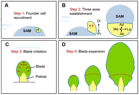 Schematic illustration of four steps during leaf development. (A) The founder cells of leaf primordium are recruited from the flank of the SAM. I1, the oldest incipient primordium. (B) After initiation, the leaf primordium grows predominantly in the distal direction and establishes three growth axes: adaxial-abaxial axis (Ad-Ab), proximal-distal axis (Pr-Di), and medio-lateral axis (Me-La). Left, front view. Right, top view. (C) Afterwards, the blade initiates from the marginal regions and grows along medial-lateral axis to separate blade from petiole. (D) Finally, the blade undergoes rapid expansion, which is accompanied by cell division and cell differentiation occurring in the entire blade. The transition from cell division to differentiation shift basipetally in Arabidopsis but can be divergent in other species. Red arrows in (A–C) indicate the direction of leaf growth. Red lines in (D) indicate the arrest front. Modified from [,].