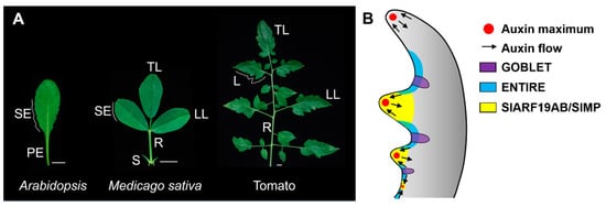 Although leaf shape varies within and between plant species, leaves are either simple or compound based on the number of blades [,]. Simple leaves (in plants such as Arabidopsis) have a single blade attached to a petiole. Serrations may form along the margins of simple leaves. Compound leaves (in plants such as tomato and Medicago truncatula) have separate blades known as leaflets attached to a common rachis. Tomato leaves consist of a terminal leaflet and (usually) three pairs of lateral primary leaflets attached to a rachis (Figure 3). Each leaflet consists of a lamina supported by a petiolule. Some primary leaflets develop secondary leaflets. In addition, intercalary leaflets form between primary leaflets []. Medicago leaves consist of a terminal leaflet and two lateral leaflets attached to a rachis (Figure 3), with two stipules present at the leaf base []. Like the margins of simple leaves, leaflet margins can be smooth, serrated, or lobed. For example, tomato leaflets have lobed margins, and Medicago leaflets have serrated margins.