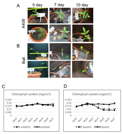 Two zombi pea varieties, the waterlogging-tolerant “A408” and the waterlogging-sensitive “Bali”, were selected based on the contrasting phenotype in response to waterlogging. “A408”, a native pasture on the verge of a swamp, is highly waterlogging-tolerant []. “Bali” is an Asian cultivated zombi pea found in Bali, Indonesia []. The contrasting phenotype of these natural varieties was initially tested by growing them in pot soils and waterlogging for 30 days (data not shown). In this study, we applied waterlogging at the seedlings stage (15 day-old). Under long-term waterlogging stress (WS), “A408” was able to maintain growth based on the visual examination (Figure 1A). On the other hand, “Bali” displayed stunted growth of its phenotype under WS (Figure 1B). Analysis of leaf chlorophyll content demonstrated that under non-stress (NS), “A408” maintained its chlorophyll content between 0.014 mg/cm2 at day zero and 0.017 mg/cm2 at day seven (Figure 1C). Similarly, “Bali” chlorophyll contents ranged between 0.014 mg/cm2 at day zero and 0.018 mg/cm2 at day seven under NS (Figure 1D). Further, WS did not affect “A408” chlorophyll content (Figure 1C). In contrast, the reduction of “Bali” chlorophyll content was observed between day four (0.01 mg/cm2) and day seven (0.008 mg/cm2) of WS (Figure 1D), suggesting that WS resulted in a decline in “Bali” leaf photosynthesis. The decrease in leaf chlorophyll content under WS was also observed in other WS-sensitive legume varieties [,].