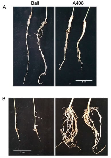 The stronger up-regulation of ACC oxidase could result in higher ethylene production in “Bali” than in “A408”. Ethylene has an important role during lateral root initiation as treatment of ethylene reduces lateral root initiation in Arabidopsis seedlings []. Moreover, Arabidopsis mutants with enhanced ethylene synthesis or perception decreased lateral root formation, while ethylene-insensitive mutants increased the number of lateral roots []. Furthermore, Muday et al. [] discussed the antagonistic roles of auxin and ethylene in controlling lateral root formation, in which the control of lateral root development by ethylene involves changes in auxin transport and accumulation patterns [].