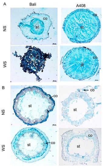 Waterlogging induces aerenchyma and extra-cellular airspace in hypocotyls and roots of “A408”. Cross-section of “A408” and “Bali” (A) taproot and (B) hypocotyl. co = cortex. st = stele.