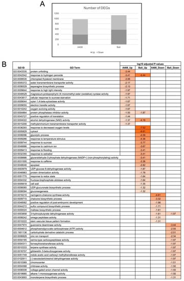 For differential gene expression analysis, reads were mapped back to the assembled transcriptome. The majority of reads (96–97%) from each RNA-seq library could be mapped to the reference transcriptome (Table S1), suggesting the reliability of our transcriptome data. The number of reads aligned back to each transcript was acquired for differential gene expression analysis. Transcriptome analysis identified 982 differentially-expressed genes (DEGs) and 1133 DEGs with significant changes in gene expression evaluated by the false discovery rate (FDR) <0.05 from “A408” and “Bali”, respectively (Figure 4A; Table S3). For “Bali”, 51% and 49% of DEGs were upregulated and downregulated by WS (Figure 4A; Table S3). On the other hand, a higher percentage of DEGs (61%) were downregulated compared to the percentage of upregulated DEGs (39%) in “A408” (Figure 4A, Table S3).