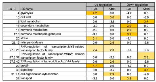 To compare the changes in WS transcriptome in the two zombi pea varieties with contrasting WS responses, comparative transcriptome analysis was analyzed by over-representation analysis (ORA) using Fisher’s exact test with a cut-off of two. The results from the ORA analysis demonstrated that glycolysis, stress, MYB-related transcription factor family, and protein functional bins were overrepresented in the upregulated DEGs of “Bali” (Figure 5; Table S4). In contrast, the upregulated DEGs of “A408” were overrepresented with cell wall, peroxidase, MYB-related transcription factor family, AUX/IAA transcription factor family, and cytoskeleton functional bins (Figure 5; Table S4). The downregulated DEGs of “Bali” were overrepresented with secondary metabolism, hormone metabolism (including gibberellin), and transport functional bins (Figure 5; Table S4). For “A408”, the downregulated DEGs were overrepresented with lipid metabolism, WRKY transcription factor family, and signaling functional bins (Figure 5; Table S4). The results from the GO enrichment and the ORA analyses point out that differential regulation of the genes encoding for energy production pathways, hormones, RNA-regulation by AUX/IAA family, cell wall modification, water transmembrane transporters, and peroxidase enzymes could contribute to waterlogging tolerance in zombi pea.