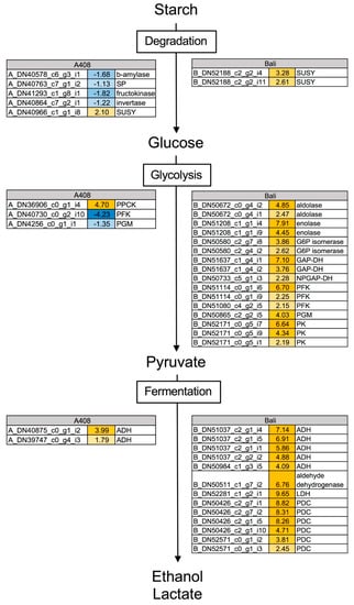 Waterlogging caused differential expression of major carbohydrate metabolism, glycolysis, and fermentative genes in roots of “A408” and “Bali”. The number indicates log2 fold changes. Blue indicates down-regulation. Yellow indicates up-regulation. Data can be found in Table S3.