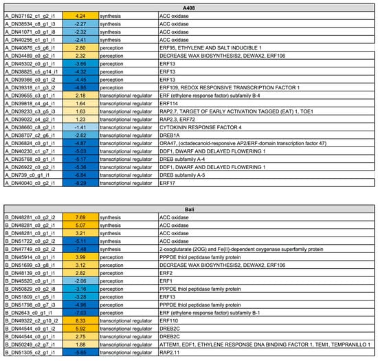 Differential expression pattern of ethylene synthesis, perception and transcriptional regulator genes in roots of “A408” and “Bali” subjected to WS. The number indicates log2 fold changes. Blue indicates down-regulation. Yellow indicates up-regulation. Data can be found in Table S3.