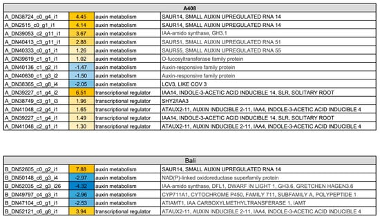 Differential expression pattern of auxin metabolism and transcriptional regulator genes in roots of “A408” and “Bali” subjected to WS. The number indicates log2 fold changes. Blue indicates down-regulation. Yellow indicates up-regulation. Data can be found in Table S3.