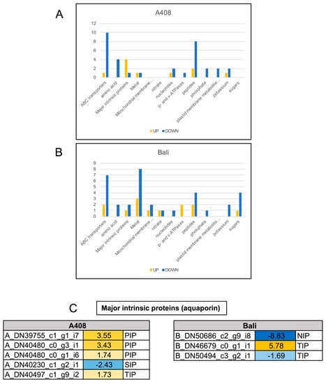 Differential expression of transport genes in roots of “A408” and “Bali” subjected to WS. Graphical representation of WS-regulated transport genes based on their assigned protein families. “Up” and “Down” represent up-regulation and down-regulation in this analysis. (A) “A408”. (B) “Bali”. (C) Expression patterns of major intrinsic protein (aquaporin) genes in roots of “A408” and “Bali” under WS. The number indicates log2 fold changes. Blue indicates down-regulation. Yellow indicates up-regulation. Data can be found in Table S3.