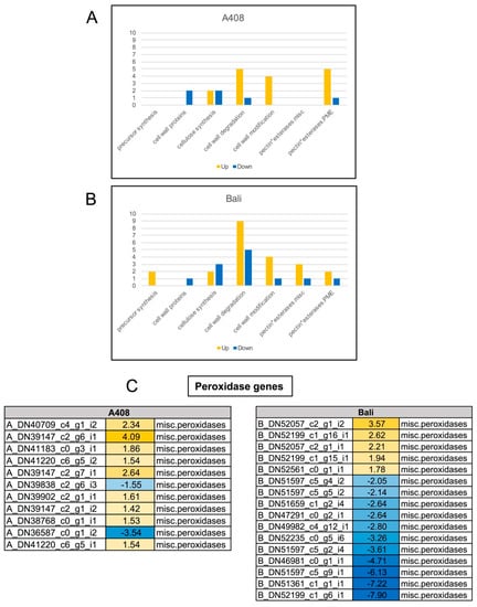 Differential expression of cell wall-related and peroxidase genes in roots of “A408” and “Bali” subjected to WS. Graphical representation of WS-regulated cell wall-related genes based on their assigned protein families. “Up” and “Down” represent up-regulation and down-regulation in this analysis. (A) “A408”. (B) “Bali”. (C) Expression patterns of peroxidase genes in roots of “A408” and “Bali” under WS. The number indicates log2 fold changes. Blue indicates down-regulation. Yellow indicates up-regulation. Data can be found in Table S3.