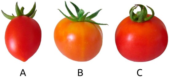 Fruits of the three tomato landraces harvested at commercial ripening: (A) Manduria; (B) Giallo di Crispiano; (C) Regina.